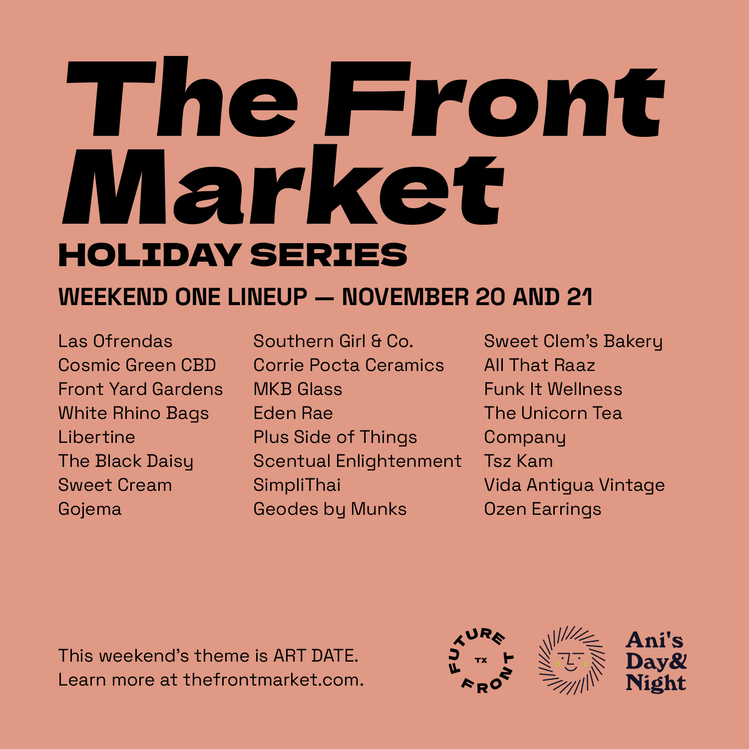 In collaboration with our friends at Ani’s Day and Night, we're hosting four outdoor markets for The Front’s holiday season.