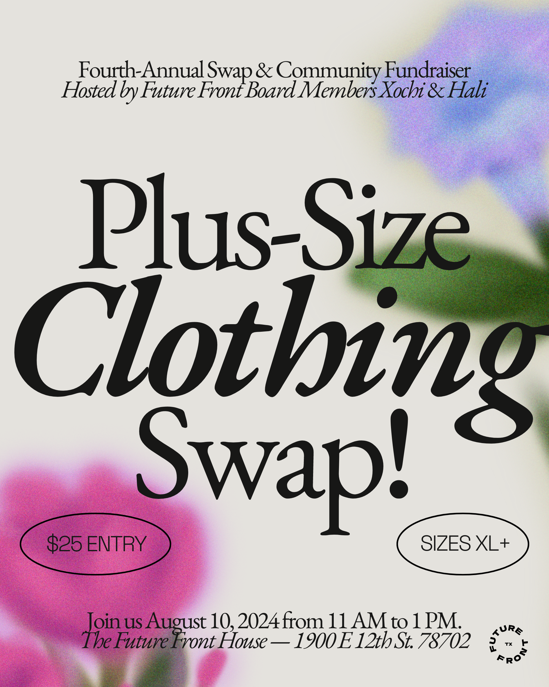 Time to clear out your closet & snag new-to-you garments! Hosted by Future Front board members Xochi Solis and Hali Martin, this event's one-part swap and one-part fundraiser for Future Front’s third birthday. So, join us to support our little org AND keep clothing out of landfills.