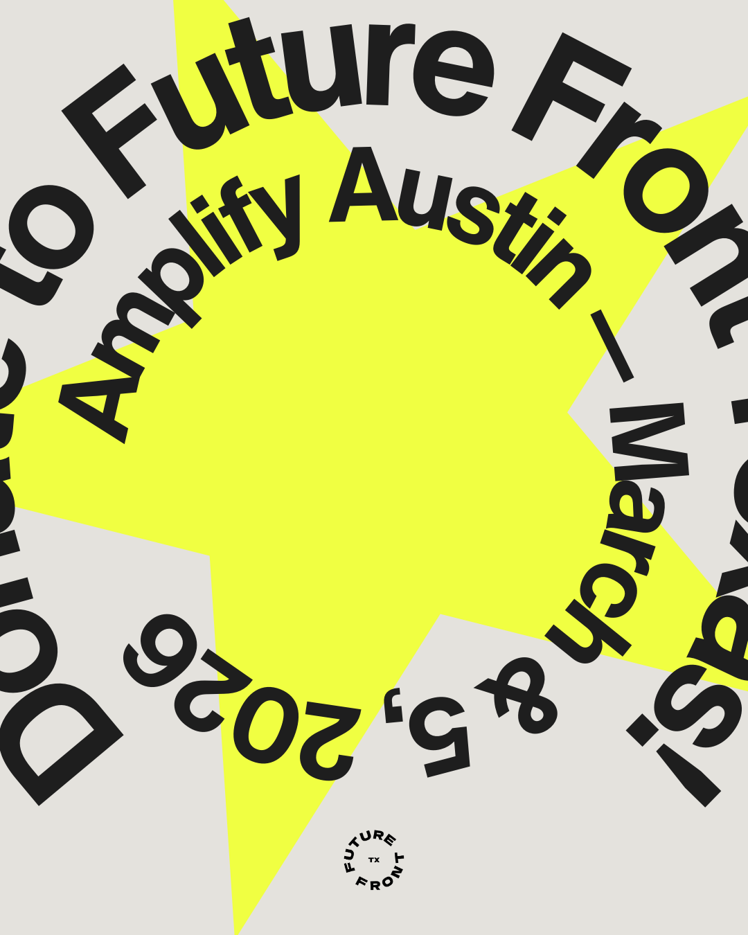 FUTURE FRONT IS SUPPORTED IN PART BY The City of Austin Economic Development Department, Tito’s Handmade Vodka, Texas Commission on the Arts, The LINE Hotel Austin, Pease Park Conservancy, Preservation Austin, Movability, ART FOR ALL, Partiful, Moontower Rentals, Distribution Hall, Miscellaneous Rentals, the Red River Cultural District, Topo Chico, as well as Future Front’s donors and members.