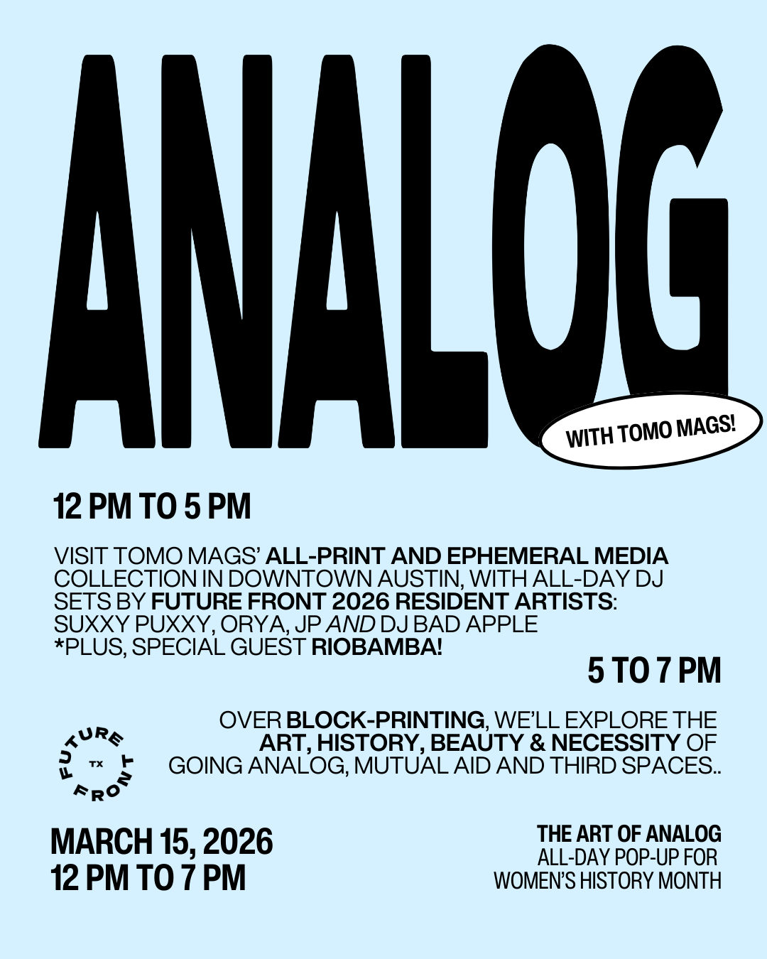 Visit Tomo Mags’ all-print and ephemeral media collection in downtown Austin, with all-day DJ sets by Future Front 2026 resident artists: Suxxy Puxxy, ORYA, JP and DJ BAD APPLE. Plus, special guest RIOBAMBA!
