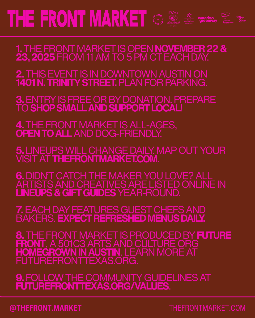 Thanks to Waterloo Greenway, Tito's Handmade Vodka, Texas Commission on the Arts, City of Austin's Economic Development Department, Topo Chico, Miscellaneous Rentals and Moontower Rentals, The Front Market is free and open to the public.