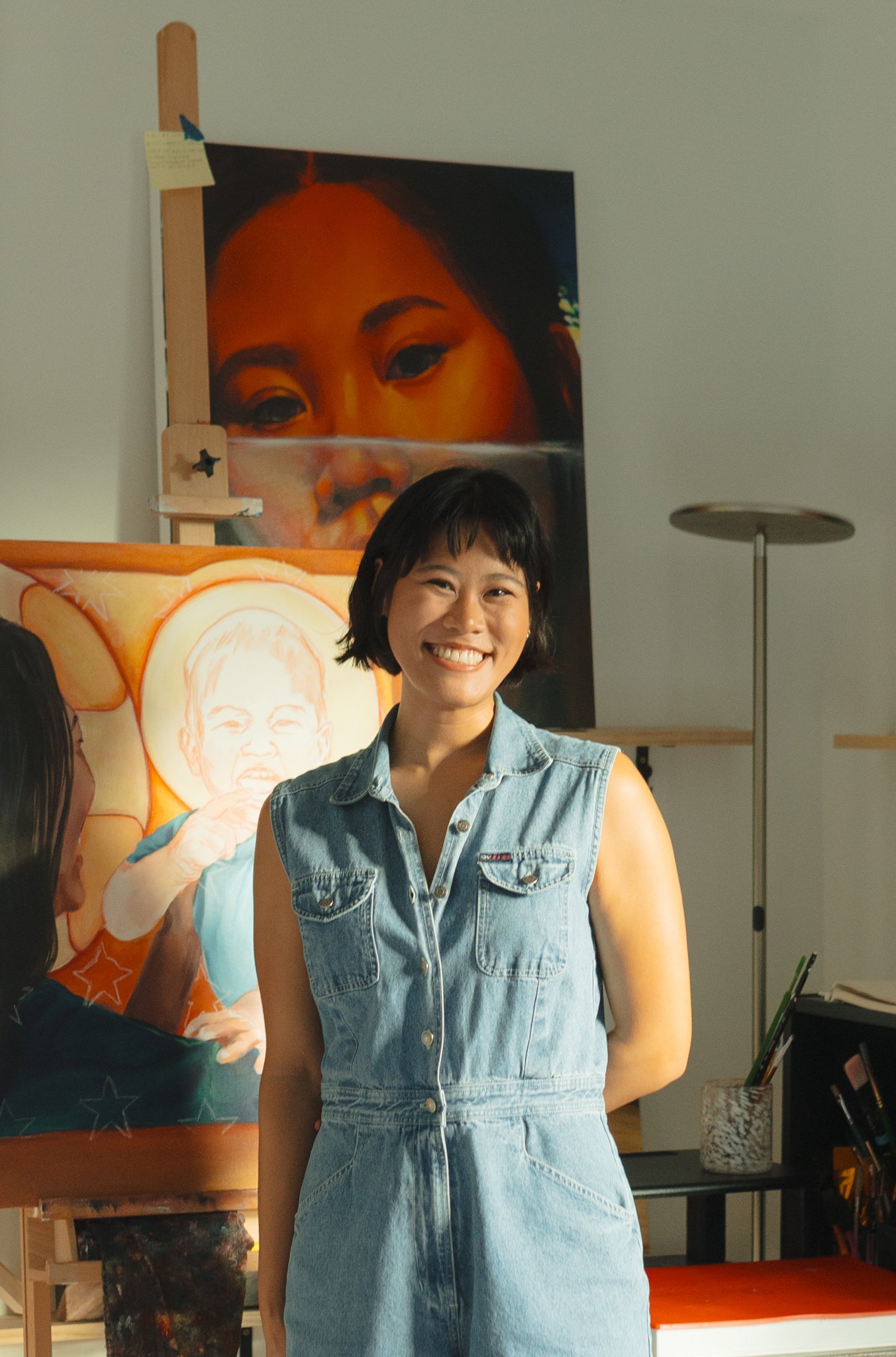 Rewon Shimray is a native Austinite and biethnic Asian American who processes her cultural and queer identity through autobiographical paintings. Her compositions blend childhood photographs, popular iconography, and cultural artifacts to narrate her upbringing in white dominant and Christian fundamentalist spaces. Rewon’s paintings offer a site of contemplation, recognition and connection. She earned a BA in Journalism from Baylor University with minors in religion and studio art. Rewon has exhibited work in over a dozen Austin galleries, including her debut solo exhibition in May 2023, titled “SPLIT: Portraits of the AAPI Diaspora.” @artbyrewon