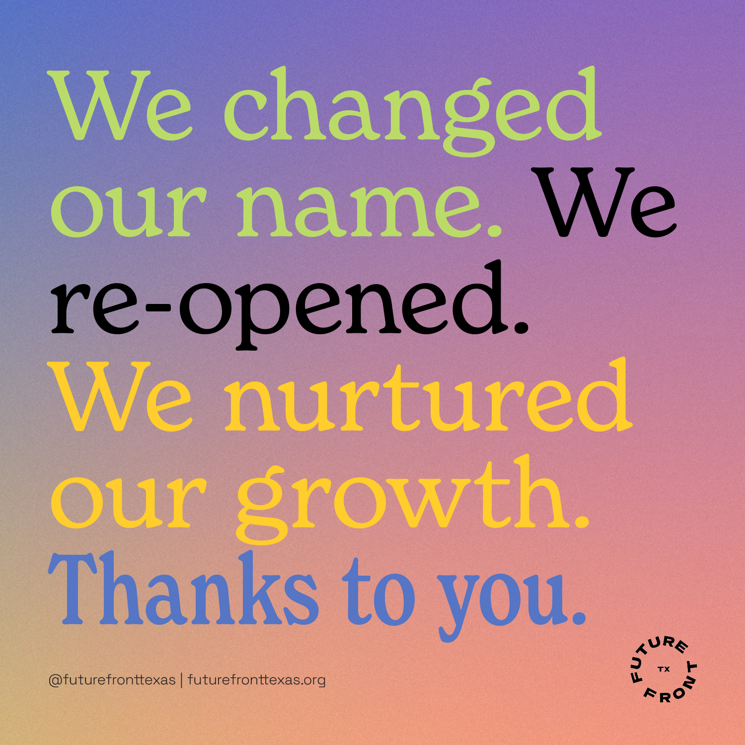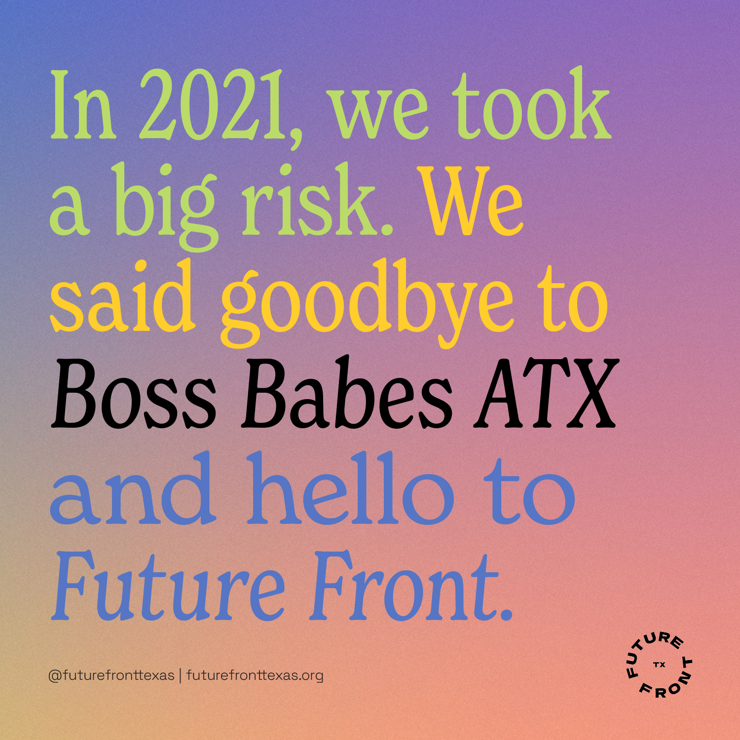 We released our new name, Future Front, as well as our manifesto, which details our vision for a Texas where women and LGBTQ+ creatives are supported, celebrated and represented at the front.